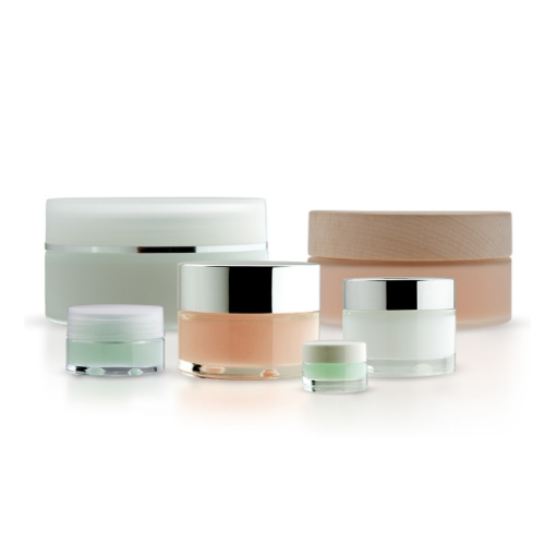 Упаковка для геля для лица или других косметических средств премиум-класса. Сделанные из стекла круглые баночки из линейки LAURENCE. В ней также представлены различные флаконы.